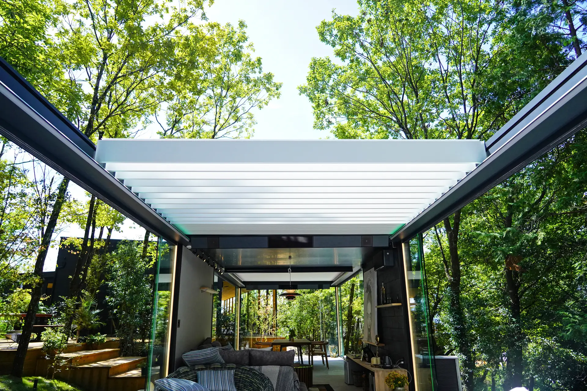 Camargue Skye vie joustavuuden uudelle tasolle. Miltä kuulostaisi mahdollisuus avata katto kokonaan ja kylpeä auringossa tai ihailla kirkasta tähtitaivasta suoraan terassiltasi? Camargue Skyen ainutlaatuisuus piilee sen patentoidussa S-Drive-tekniikassa: katon alumiiniset lamellit eivät ainoastaan käänny, vaan ne myös liukuvat pehmeästi sivuun paljastaen taivaan. Voit säätää valoa ja ilmanvaihtoa kääntämällä lamelleja tai vetää ne kokonaan syrjään maksimoidaksesi luonnonvalon. Tyylikkäät lisävarusteet, kuten lasiseinät ja integroitu valaistus, tekevät tästä ylellisen ulkoilmahuoneen, jota hallitset yhdellä napin painalluksella.