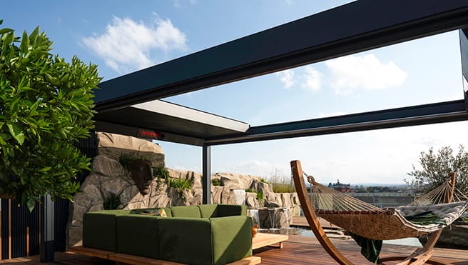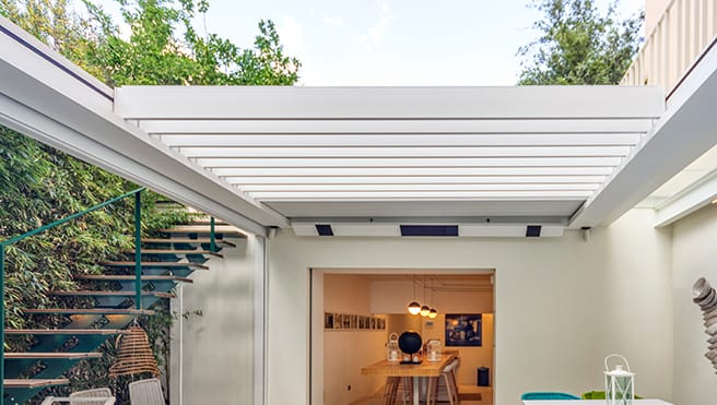 ✓ Kestävä, sisäänvedettävä, kääntyvistä säleistä koostuva kattorakenne